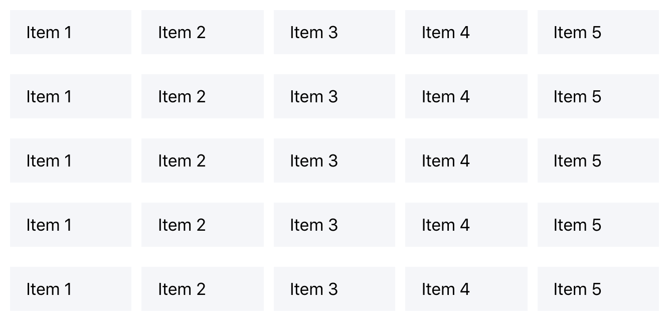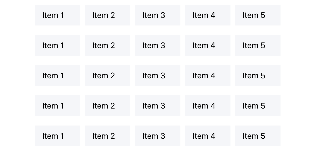 This will render 5 items with a width of 100% each. This may look great on a phone, but viewing this on a larger screen is a different story. The items become stretched to fill the entire screen because of the wide screen width, leaving screen space unused.